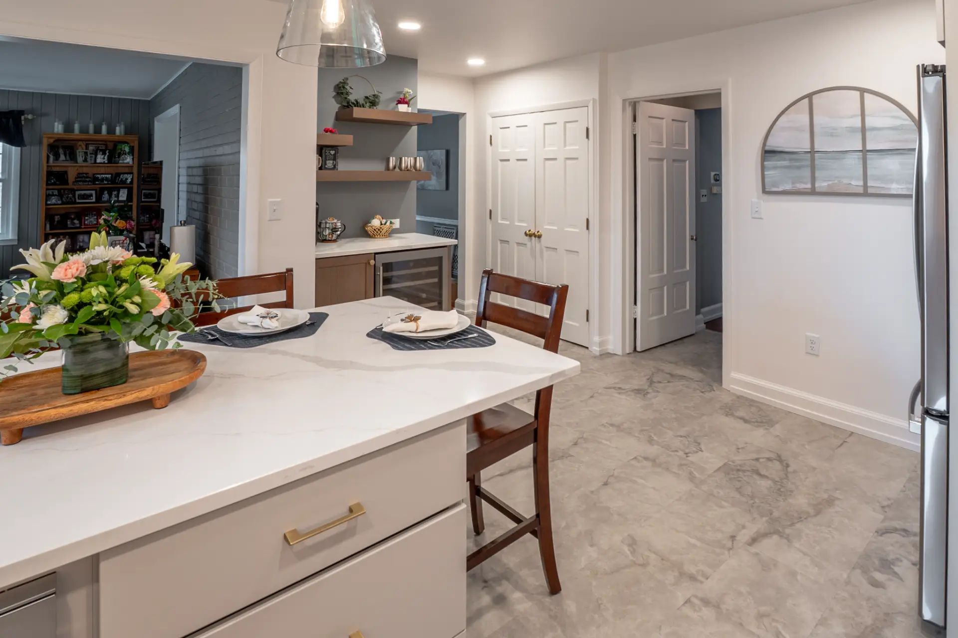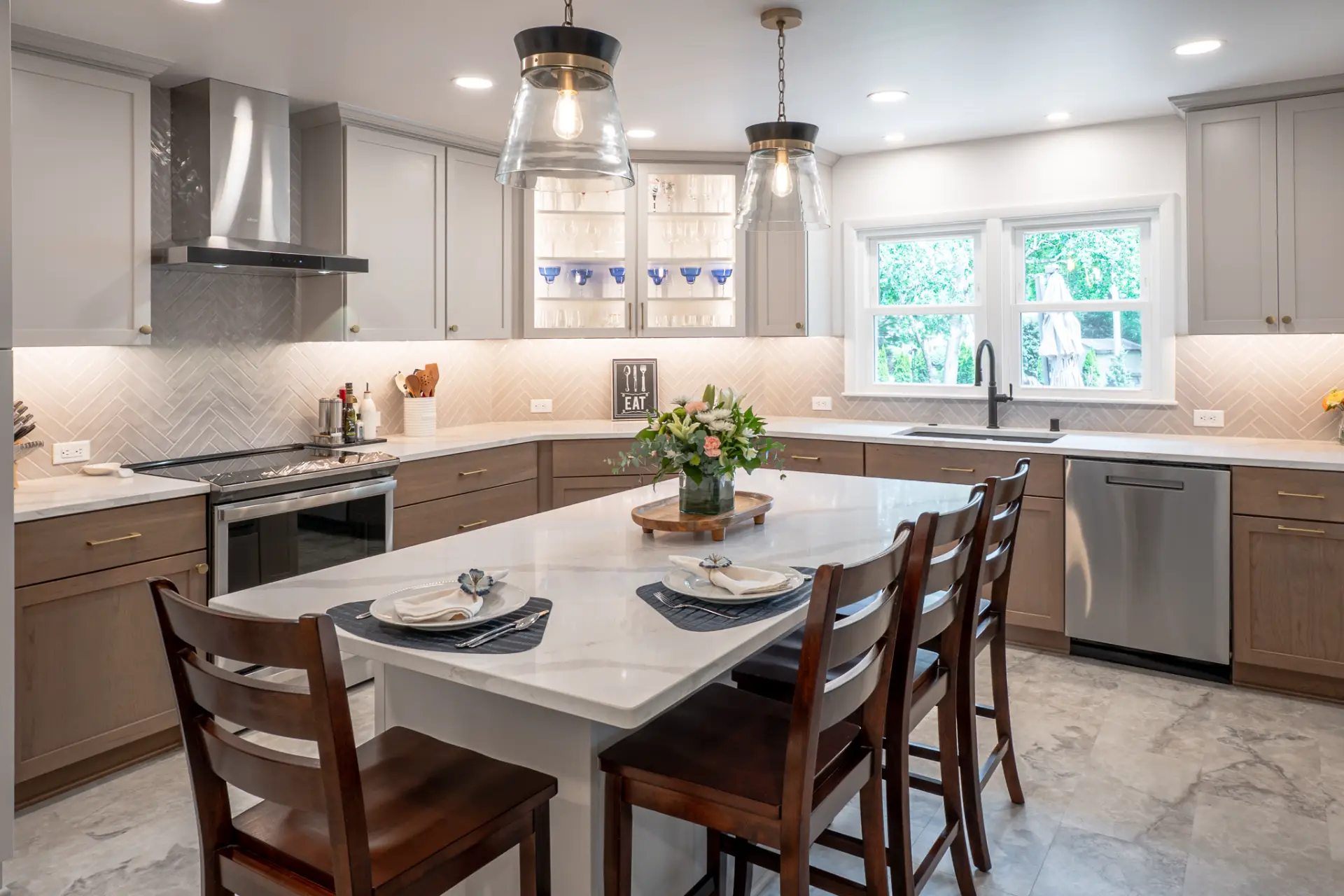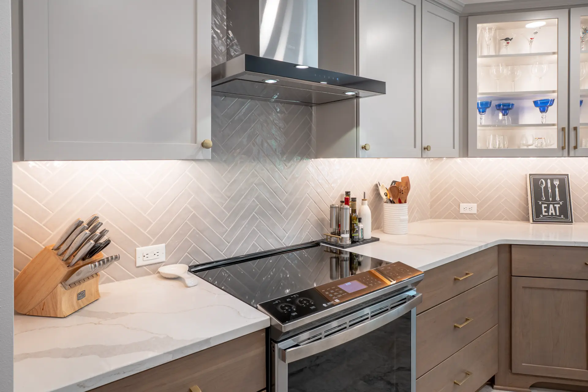 BUILD: Repose Grey StarMark Cabinetry, Quartz Countertops, Herringbone Coastal Cottage Tile Backsplash
