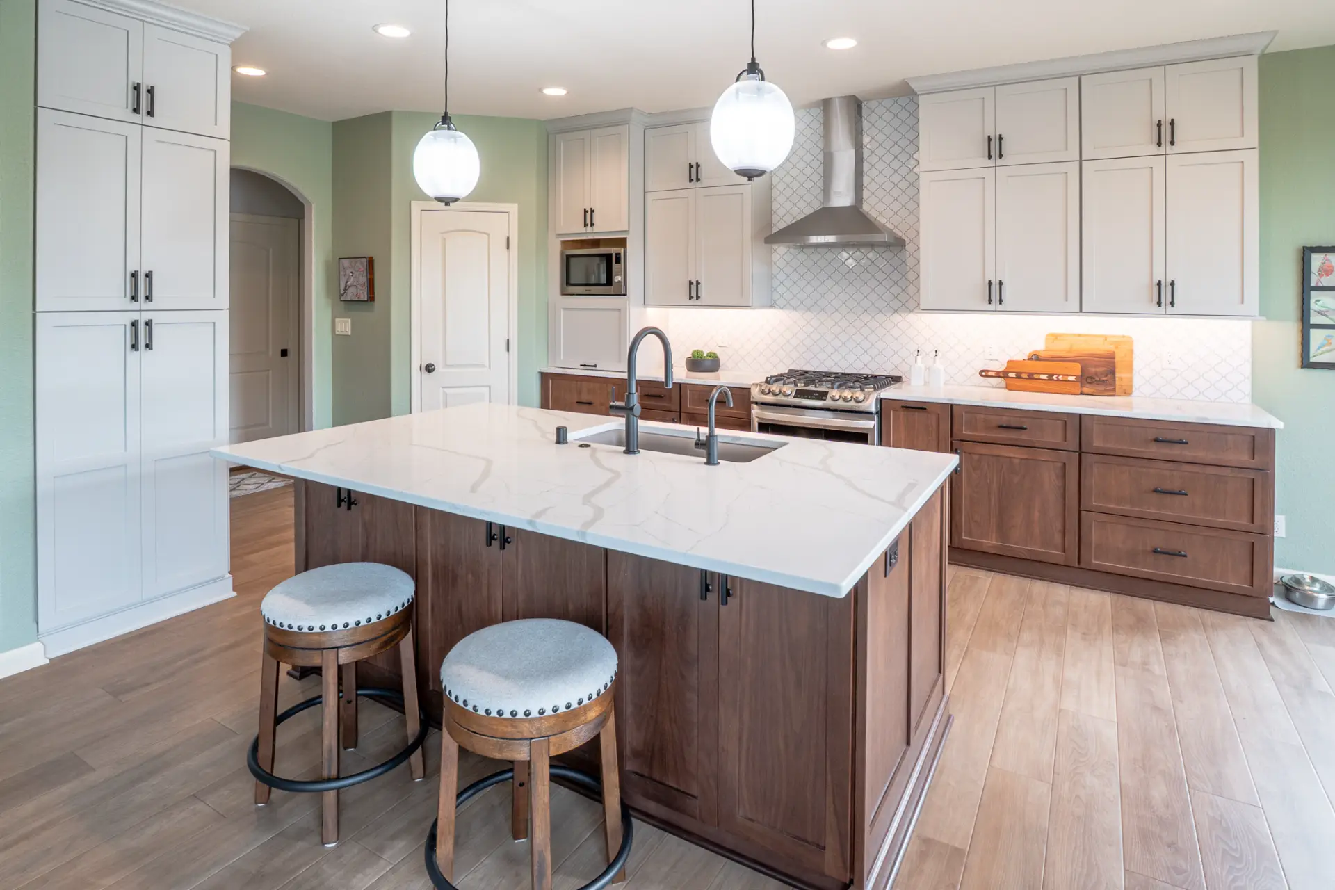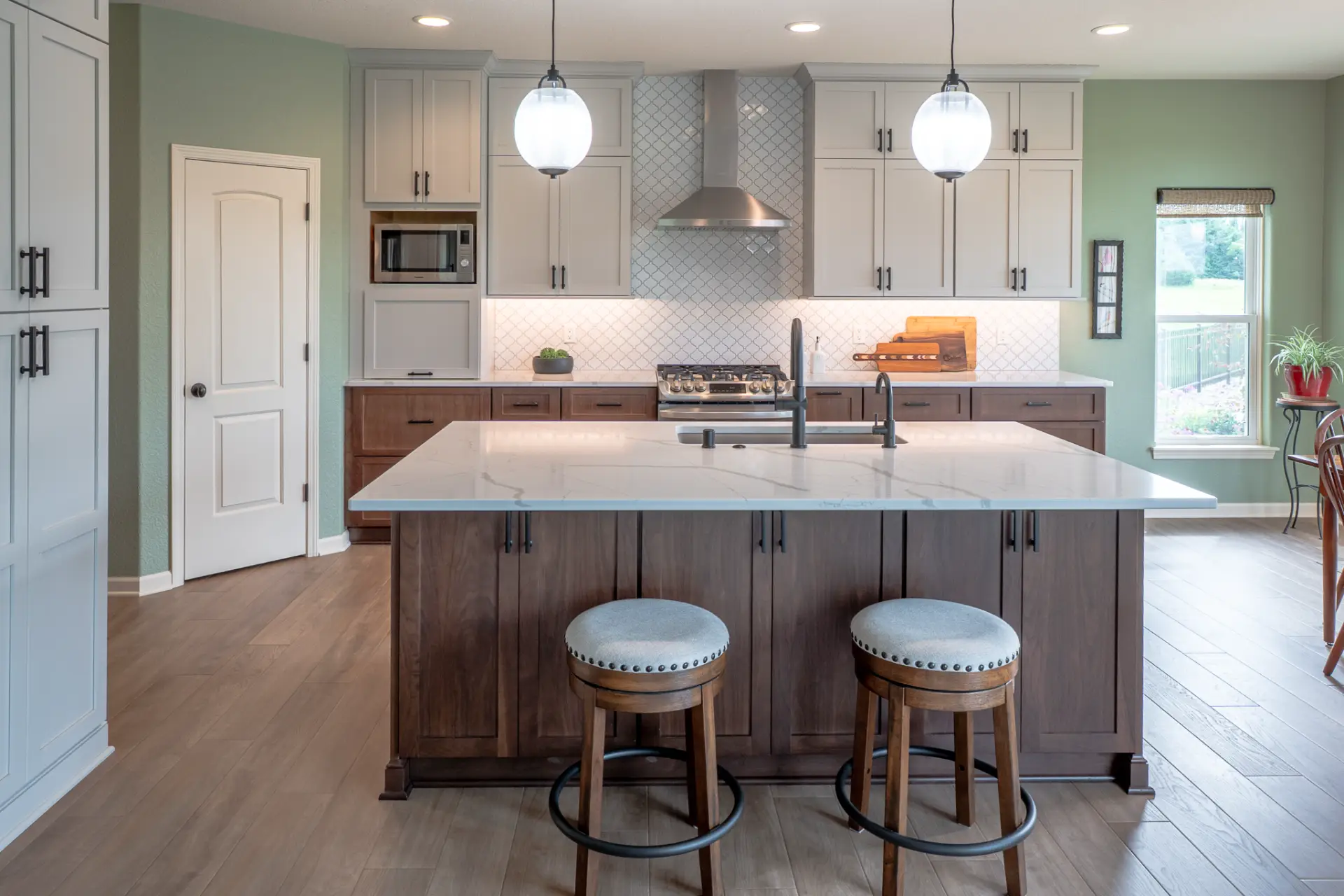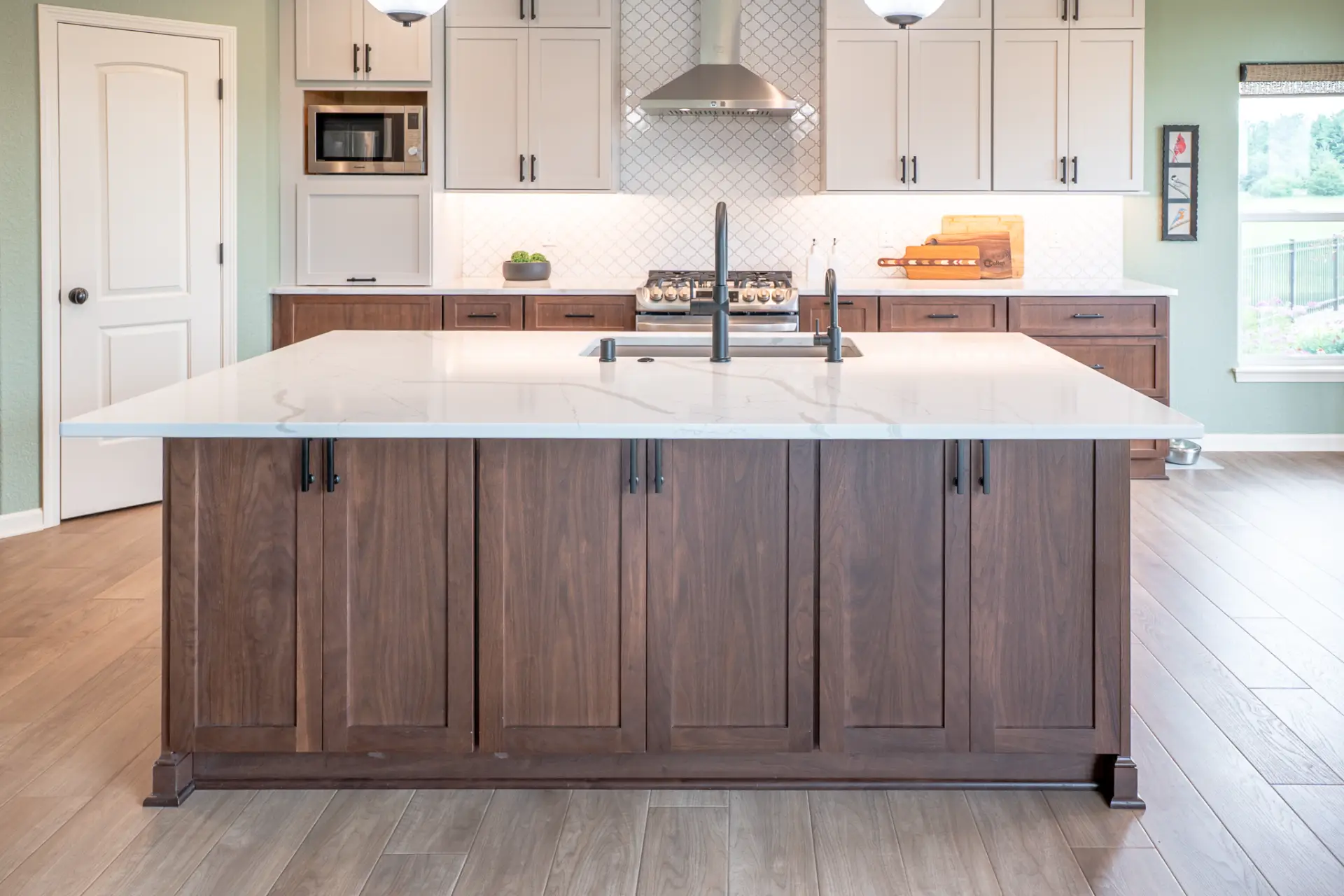 BUILD: Walnut Stained Cappuccino StarMark Cabinetry, ENVI Quartz Countertops, Mosaic Tile Backsplash