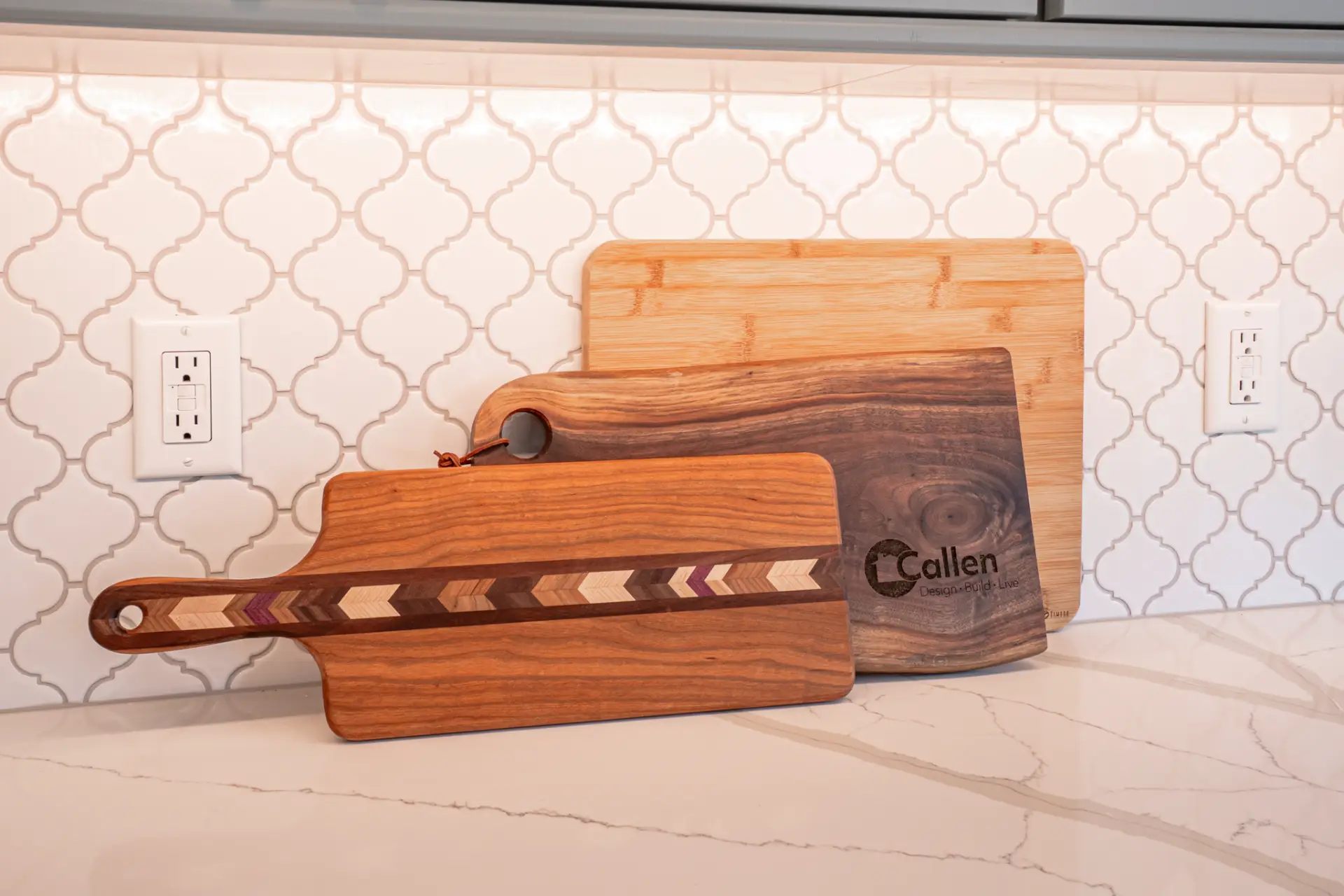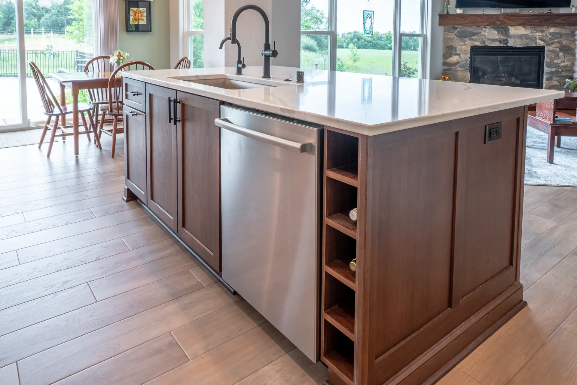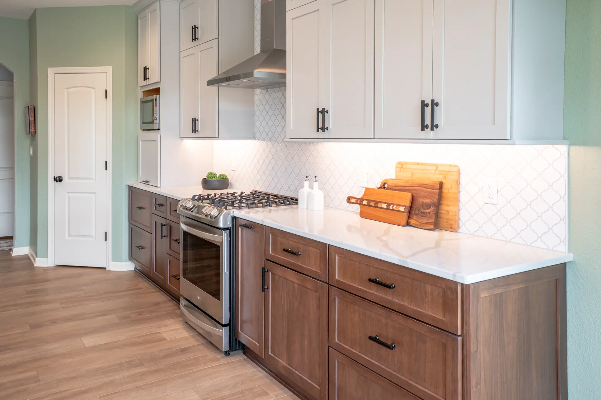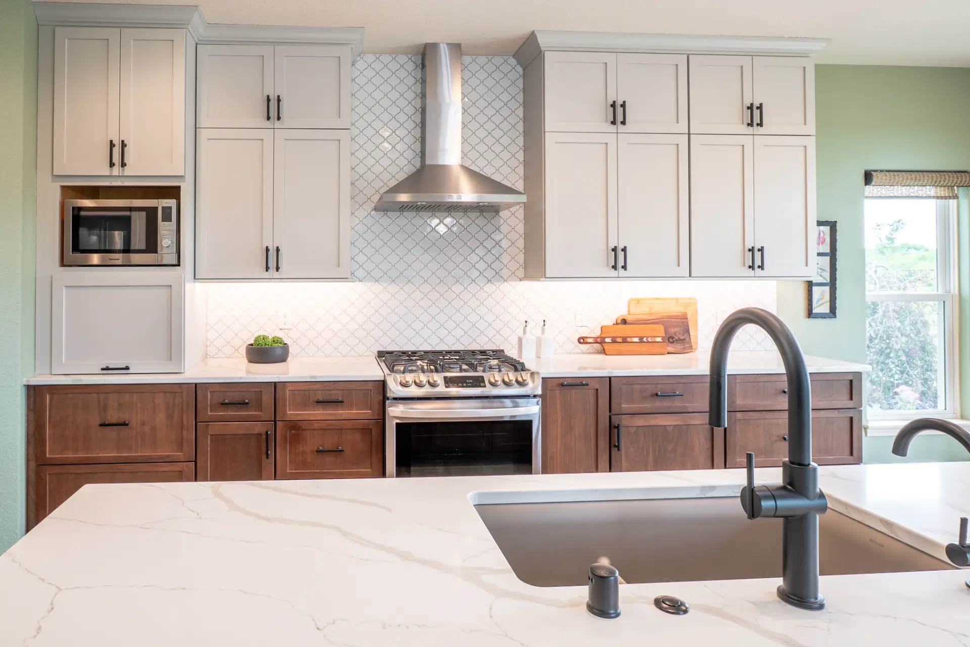 BUILD: Walnut Stained Cappuccino StarMark Cabinetry, ENVI Quartz Countertops, Mosaic Tile Backsplash